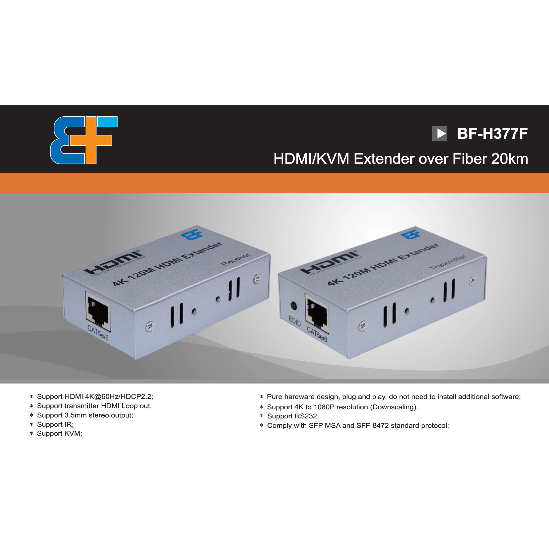 BF+ HDMI KVM Extender Over Fiber 20km π | 4K@60Hz UHD πΊ | HDCP2.2 π | BF-H377F | IR π RS232 π KVM π±οΈβ¨οΈ | Loop-Out π | 3.5mm Audio π§ | SFP Fiber Module | EDID Support βοΈ | Premium Chipset π§ Metal Housing π‘οΈ 24/7 Stable Operation π₯